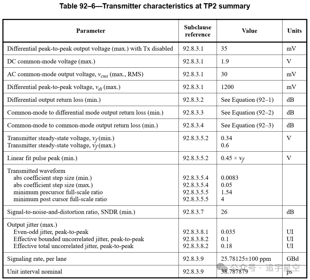 表92-6总结了发送器特性。除非另有规定,表92-6中定义的所有发送器测量都是在TP2使用规定的测试夹具进行的。除非另有规定,否则所有发射机信号测量都将使用具有33GHz 3dB带宽的四阶贝塞尔-汤姆逊低通响应的测试系统。附录92A详细提供了TP0的发送器规格。