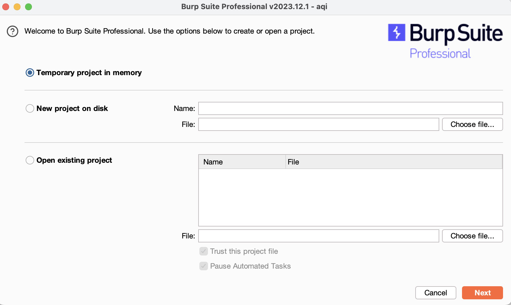 去portswigger官网下载Burp Suite,可以选择社区版(community),也可以选择专业版(professional)。我安装的是Burp Suite Professional,安装成功之后,创建一个Project。