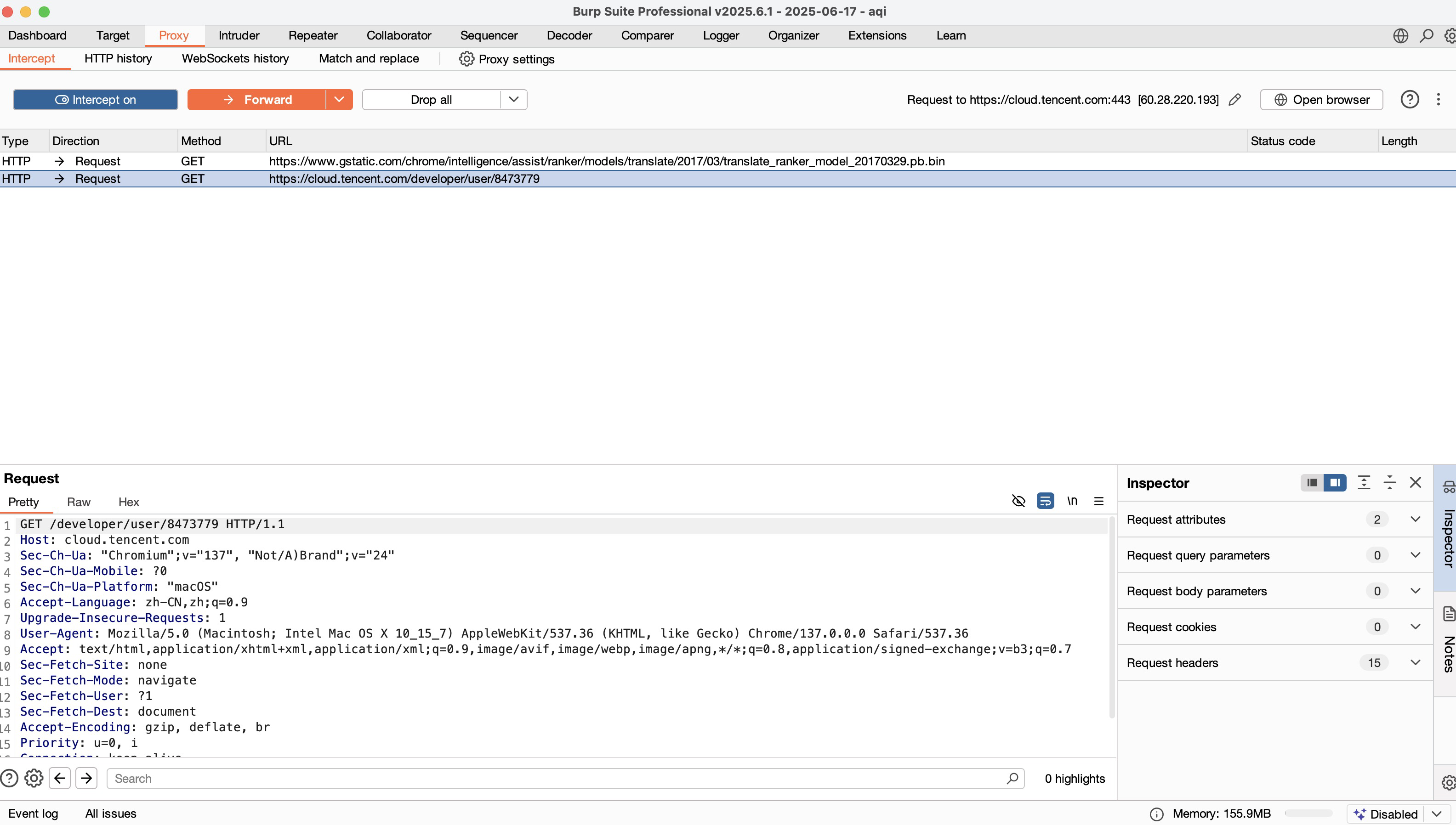 我们选中被拦截的腾讯云开发者社区请求,点击 Forward,请求就被放行了。