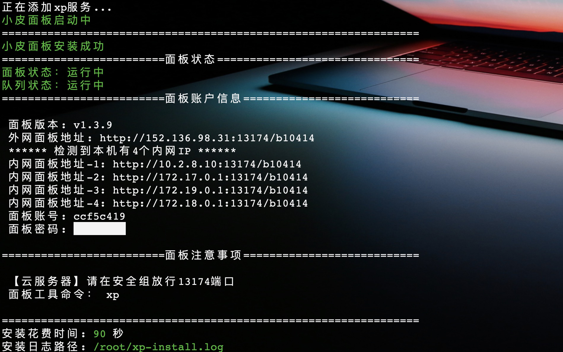 安装完成之后,可以看到小皮面板的账户信息,在新版的小皮面板中,我们要开放 13174 端口,老版是 9080,然后复制外网面板地址,通过提供的账号和密码进行登录。
