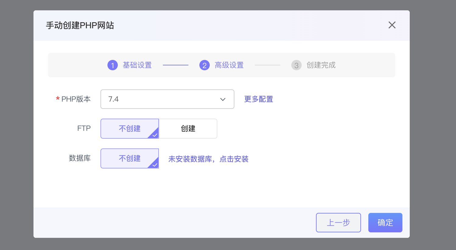 点击下一步,选择PHP版本,DVWA是需要MySQL的,但是我服务器上已经安装了,所以这里数据库选择不创建。