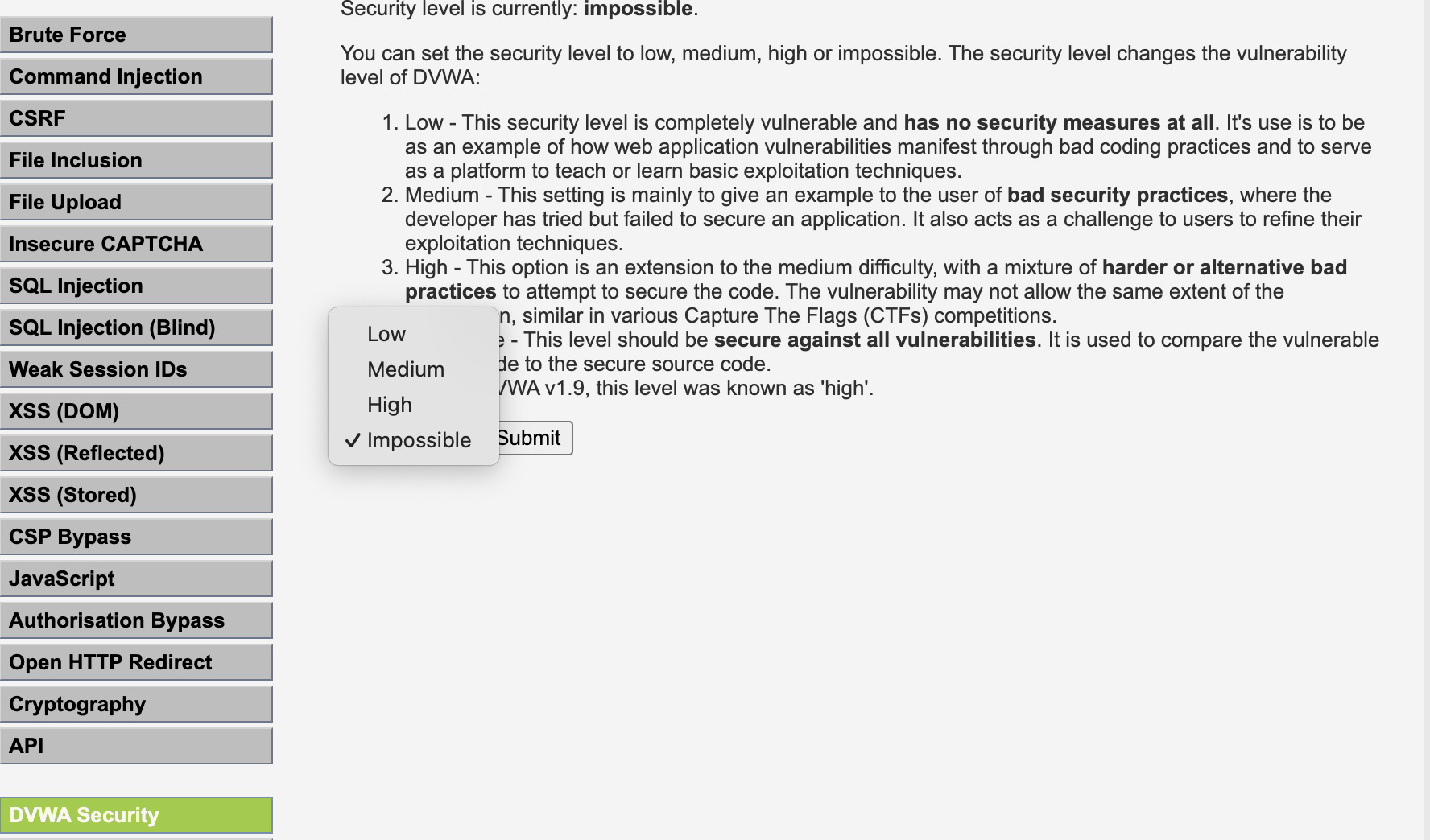 UPDATE users SET password=md5('xxx') WHERE user='admin';admin的密码就修改成了xxx。登录之后,进入到DVWA的首页,在这个页面我们可以进行不同程度的渗透测试。