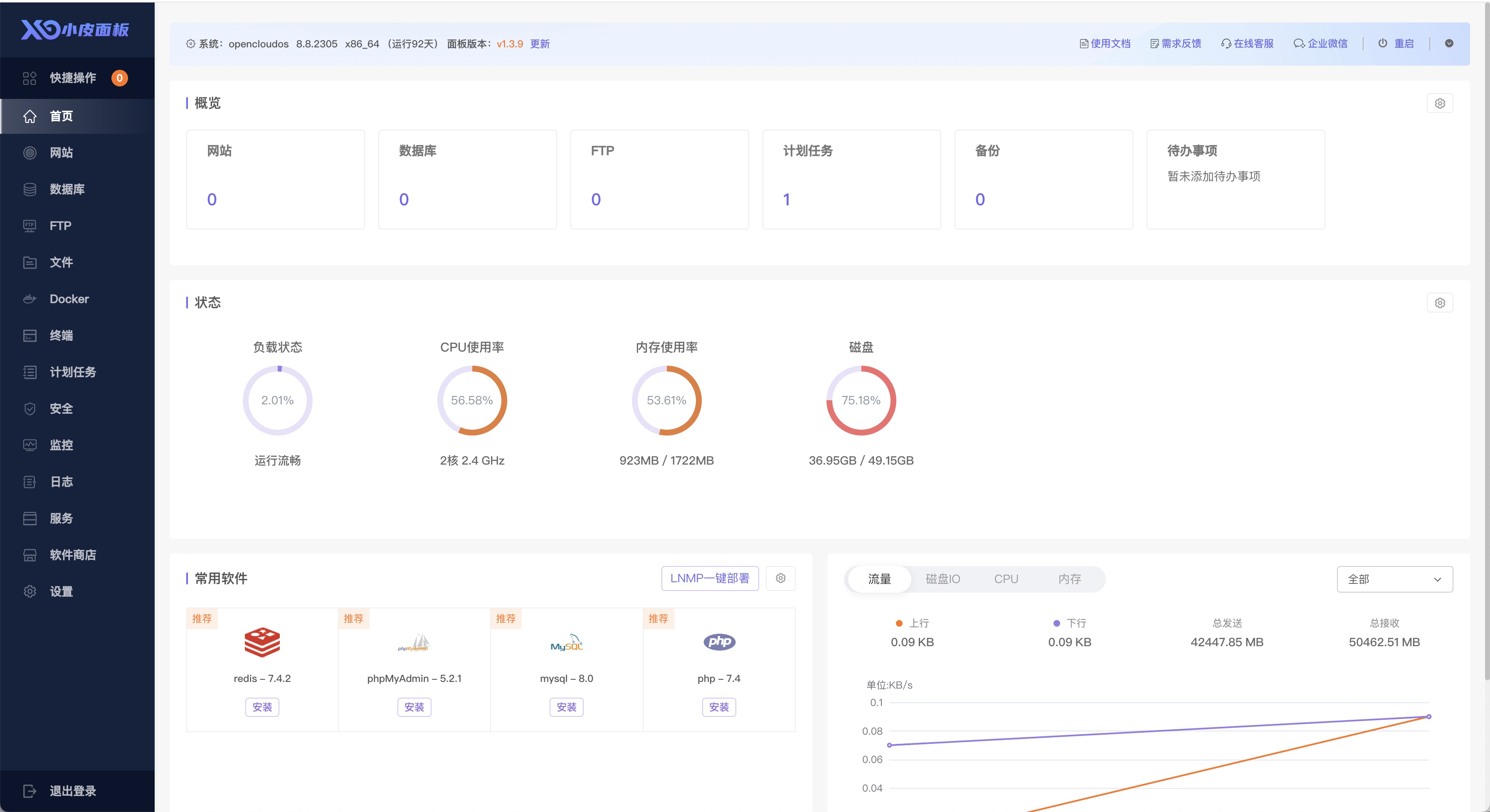 之前使用的小皮面板还是一个很老的版本,这是第一次见新版的UI,觉得还是挺好看的,而且还增加了Docker、终端等功能。接下来我们就来完成搭建DVWA所需要的环境配置,主要是: