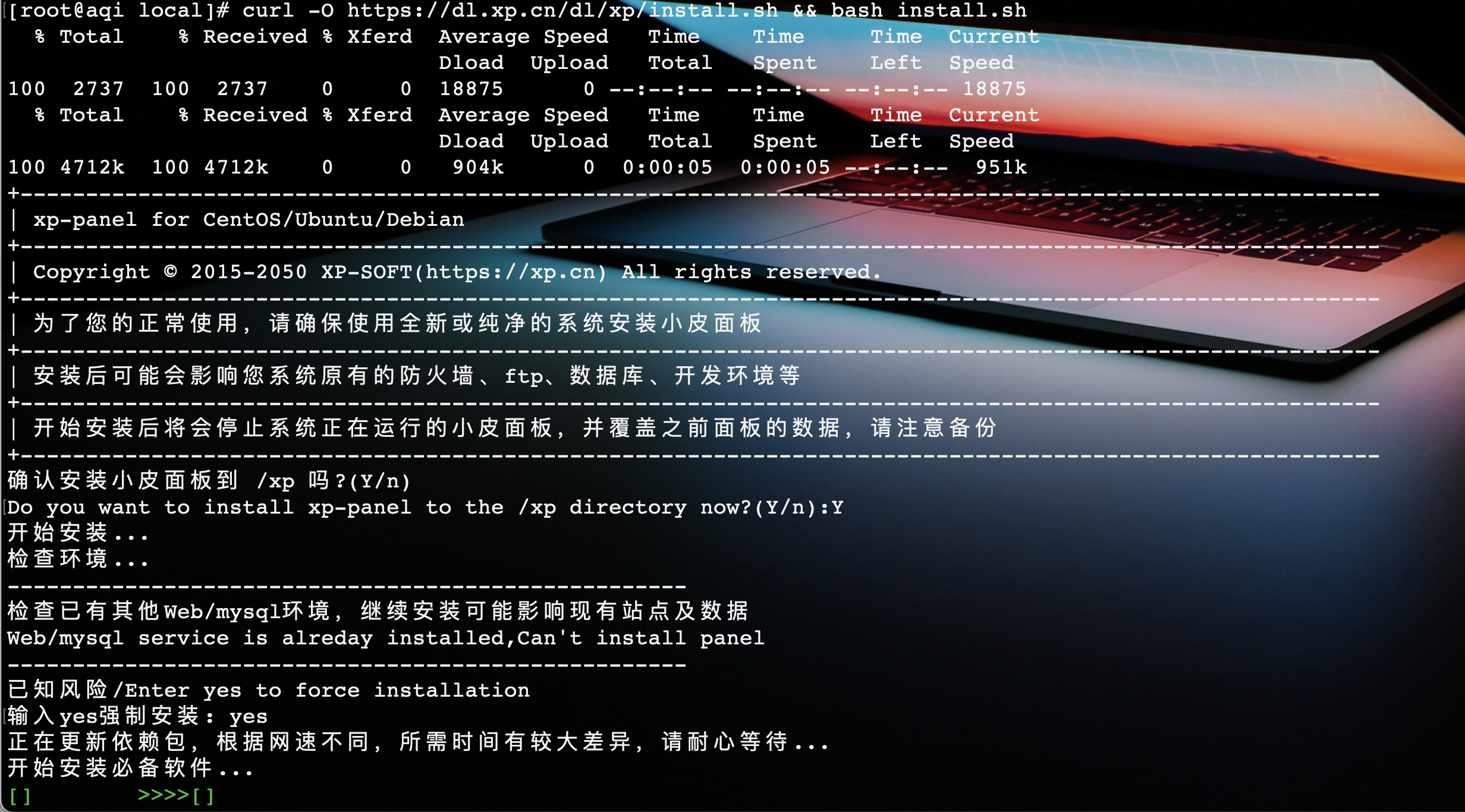 curl -O https://dl.xp.cn/dl/xp/install.sh && bash install.sh在安装过程中,我们可以看到提示:可能会影响服务器中原有的数据库、防火墙等,这里确实将我的mysql客户端替换成了小皮面板的,同时在服务器安全组的基础上,小皮面板又增加了一个防火墙,当然可以在小皮面板上一键关闭。