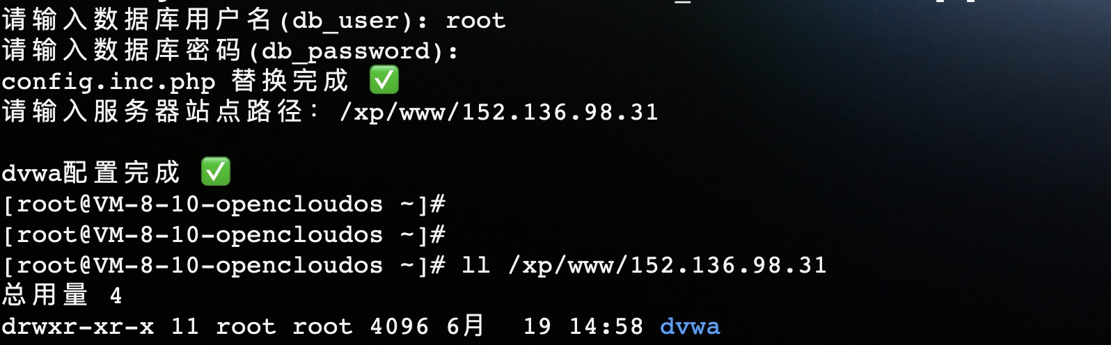 echo "dvwa配置完成 ✅"在执行脚本的过程中,脚本要求你输入MySQL的账号、密码,完成替换之后,在要求你输入服务器的路径,也就是上面让你复制的站点路径。