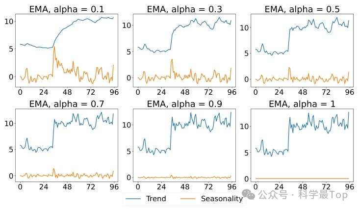 如上图所示:在ETTh1数据集上,作者采用0.1、0.3、0.5、0.7、0.9和1等不同平滑因子,对96长度样本进行指数移动平均分解。