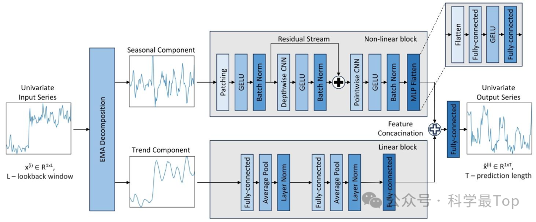 提出基于EMA的季节-趋势分解,替代传统SMA,提升分解质量。设计CNN+MLP双流架构,结合通道独立和补丁技术,在非Transformer框架下实现优异性能。引入反正切损失和Sigmoid学习率调整,优化训练过程。