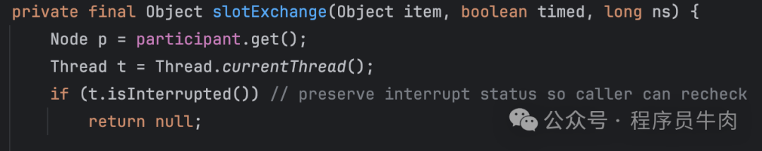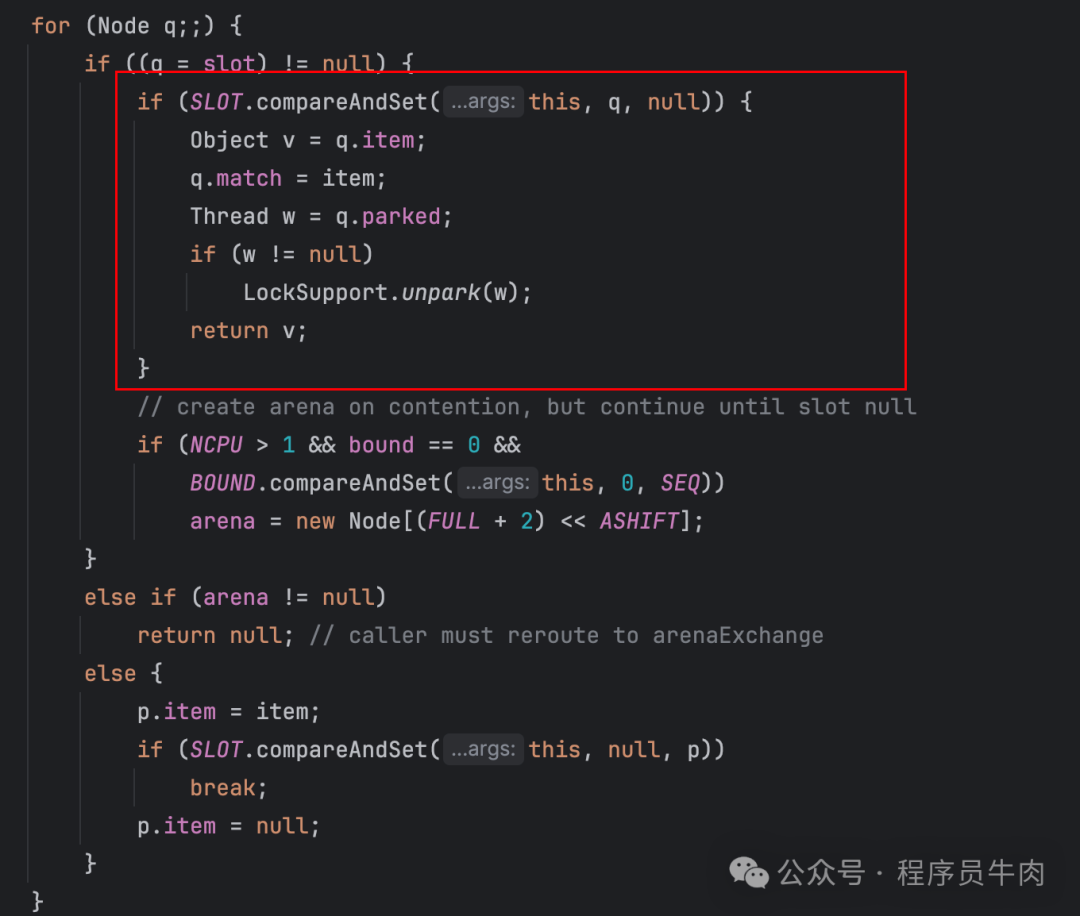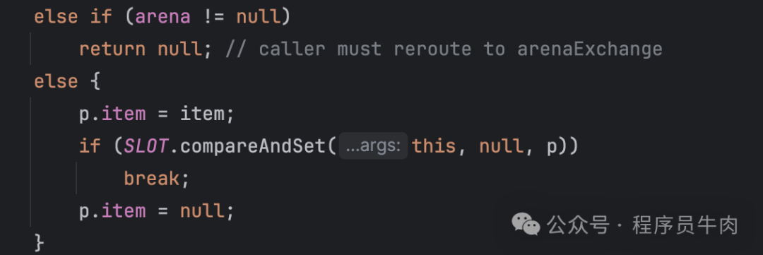 那此时还没有return的就只有两个情况,要么你是第一个进入exchange的线程,需要等待第二个线程进入来交换数据。要么你是CPU小于1且slot为空,没办法进入竞技场,只能重新进行slotExchange。