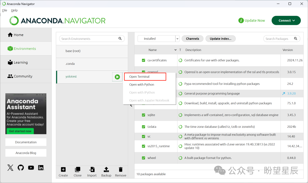 点击 Open Terminal 进入终端,显示有环境名称即为安装配置成功。