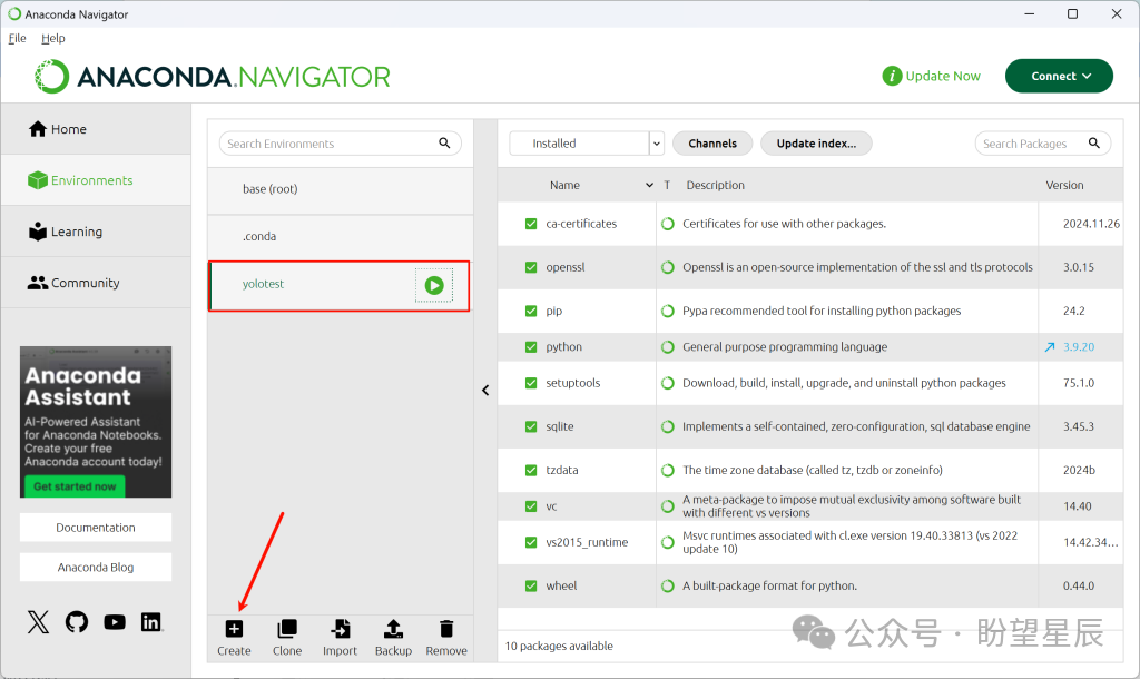 下载安装好了anaconda,启动这个软件,新建一个虚拟环境,建议使用3.9版本python,防止后续python库由于python版本问题无法安装。