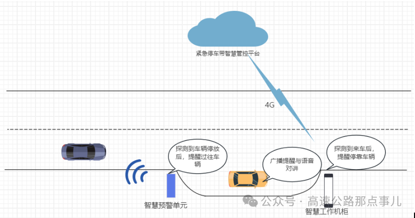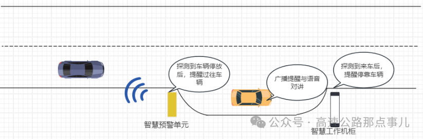系统对进入紧急停车带的车辆人员提供安全引导和帮助,对驶离停车带的车辆进行安全行驶引导,对停车带区域后方车辆提供预警。