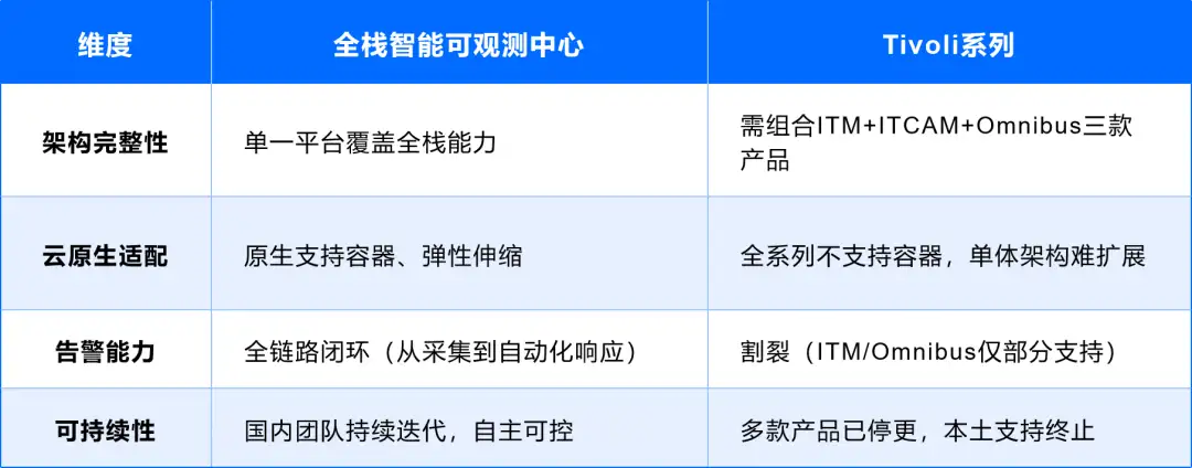 IBM Tivoli需通过多个子产品组合实现监控(ITM负责基础架构、ITCAM侧重组件监控、Omnibus处理事件管理),复杂度高且维护成本大。而全栈智能可观测中心作为现代化国产运维监控系统,旨在提供一个更现代化、更统一、更能开箱即用的全栈可观测平台,在大部分的监控场景中,全栈智能可观测中心一个产品就能实现Tivoli三个子产品的效用: