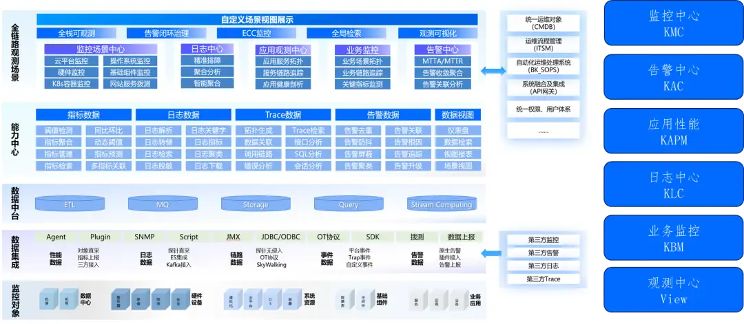 图中由下而上,依次是监控对象、数据集成、数据中台、能力中心、观测场景五层以及外部集成模块。