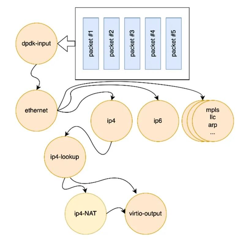 - 批量化: 将多个数据包(如64个)聚合成一个“矢量 (Vector)”,在每个处理节点上一次性完成整个矢量的操作。这摊薄了每个包的固定开销(资源准备、上下文切换),显著提升效率。