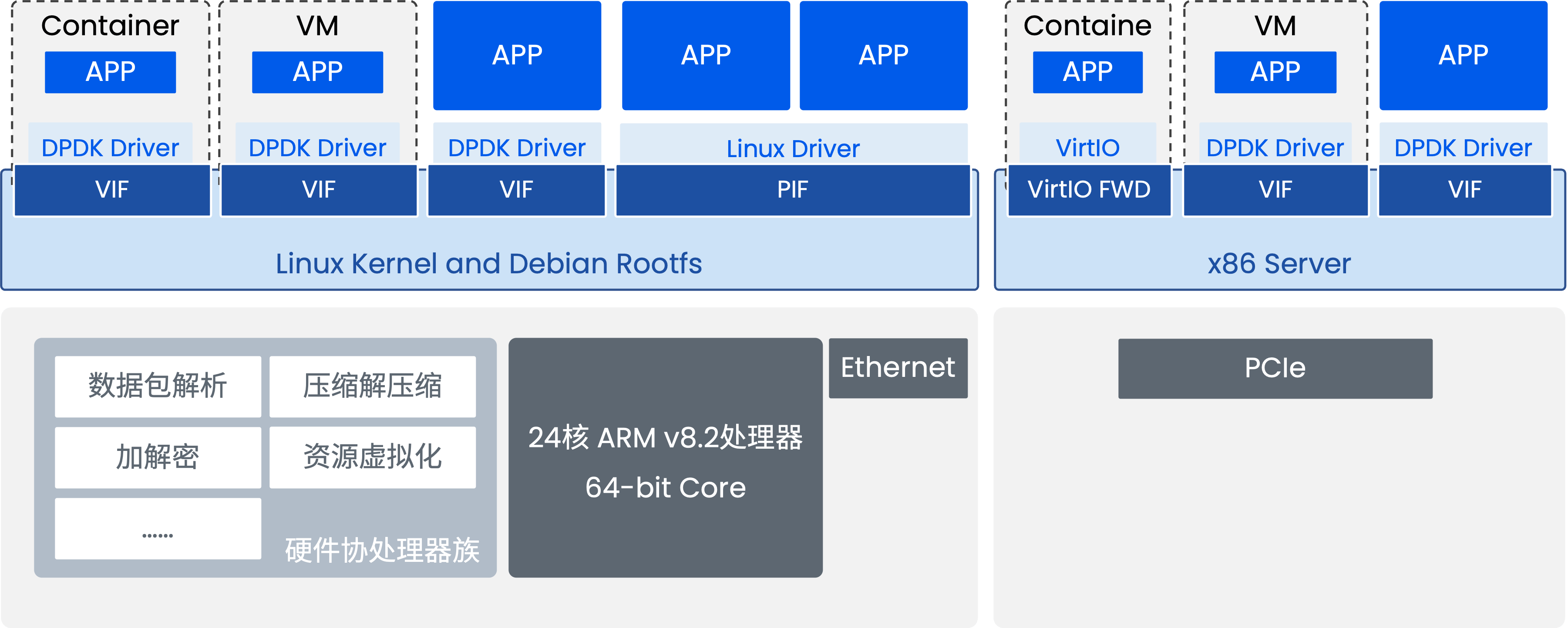- 强大的应用移植性: 基于 x86 开发的 DPDK 应用、VPP 应用、标准 Linux 驱动应用,通常只需重新编译即可快速迁移 到 Helium DPU 上运行,加速业务部署。提供 4x25G 和 2x100G 等规格。