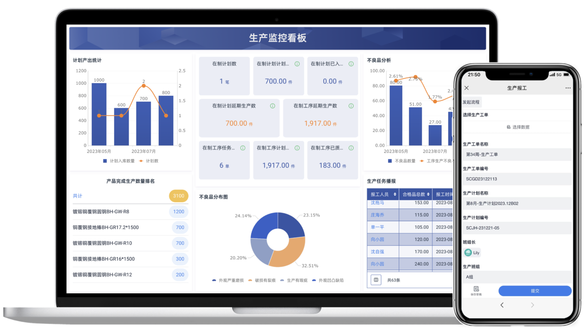 它会展示良品率、不良品率、返工返修记录、质量异常事件等。