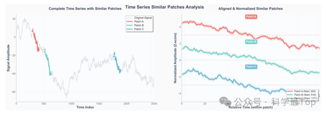 图1:相似时间序列片段及其对齐后的可视化。左图:完整信号中三个高亮显示的patch(Patch A/B/C)尽管振幅不同,但具有相同的趋势形状。右图:经过Z-Score归一化和时间对齐后,曲线几乎重叠,表明这些片段属于同一潜在b表示。