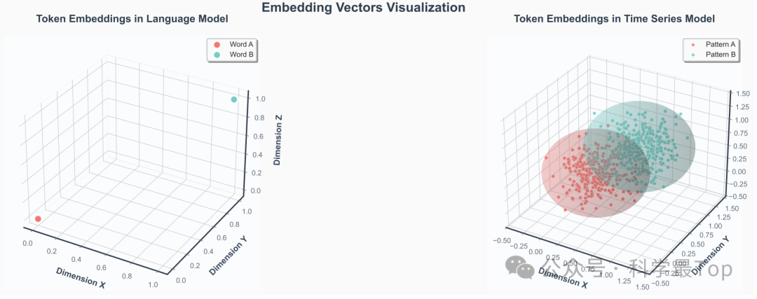 图2:语言token与时序patch嵌入的对比。左图:在语言模型中,token嵌入呈现为离散且稀疏分布的单点。右图:在时间序列模型中,patch嵌入形成具有有限厚度的概率云;同一 motifs(模式A/B)的patch聚集成可分离但内部连续的区域,阐释了“分布性token”的概念。