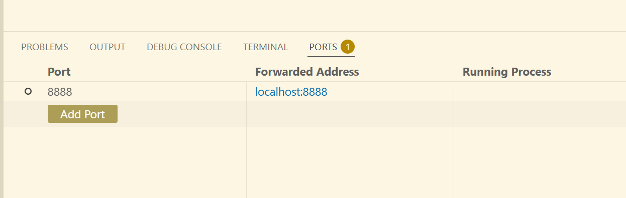 在vscode的port页,配置端口映射,将8888端口映射到本地: