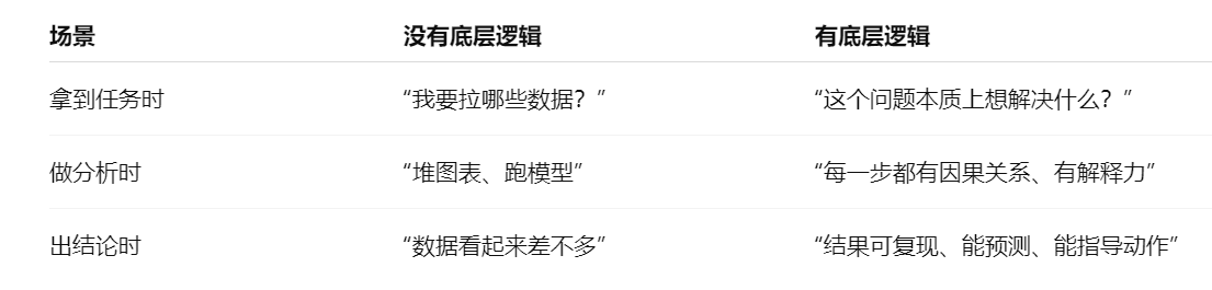 所以,构建底层逻辑不是做加法(多会几个函数、多懂几个模型),而是做减法——去掉那些没有意义的步骤,留下真正有价值的判断方式。