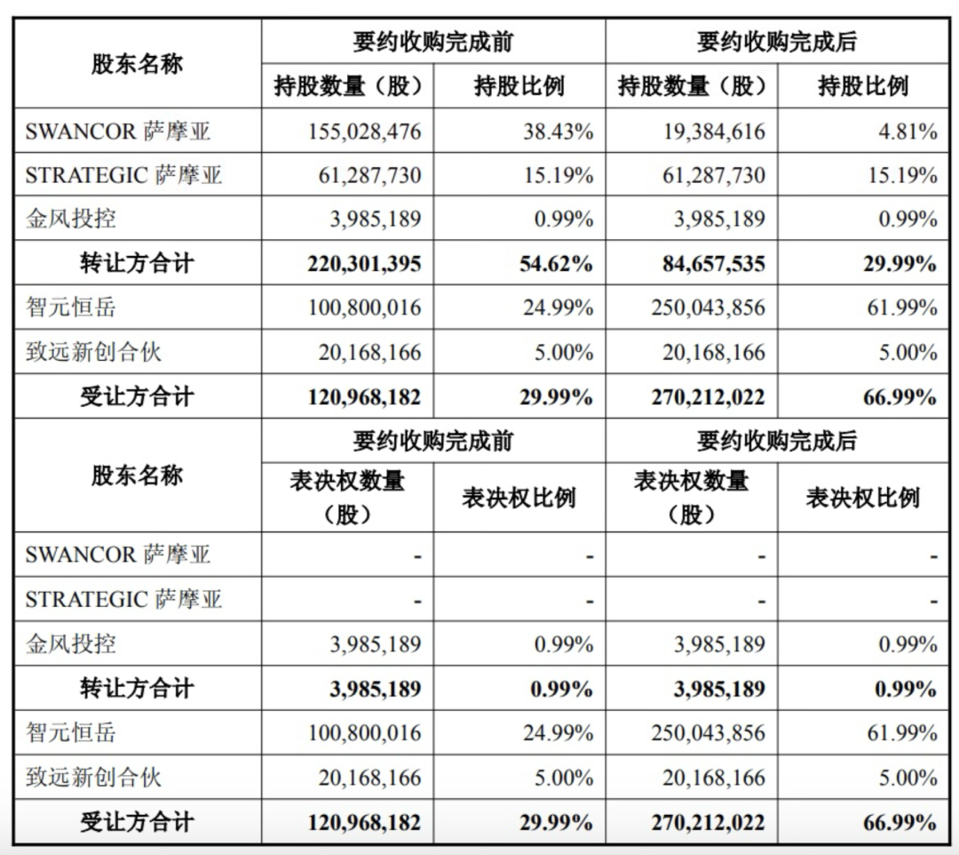 本次股份转让完成及表决权放弃后,智元恒岳、致远新创合伙合计将拥有上市公司 29.99% 的股份及该等股份对应的表决权,上市公司控股股东将由 SWANCOR 萨摩亚变更为智元恒岳,邓泰华将成为上市公司实际控制人。