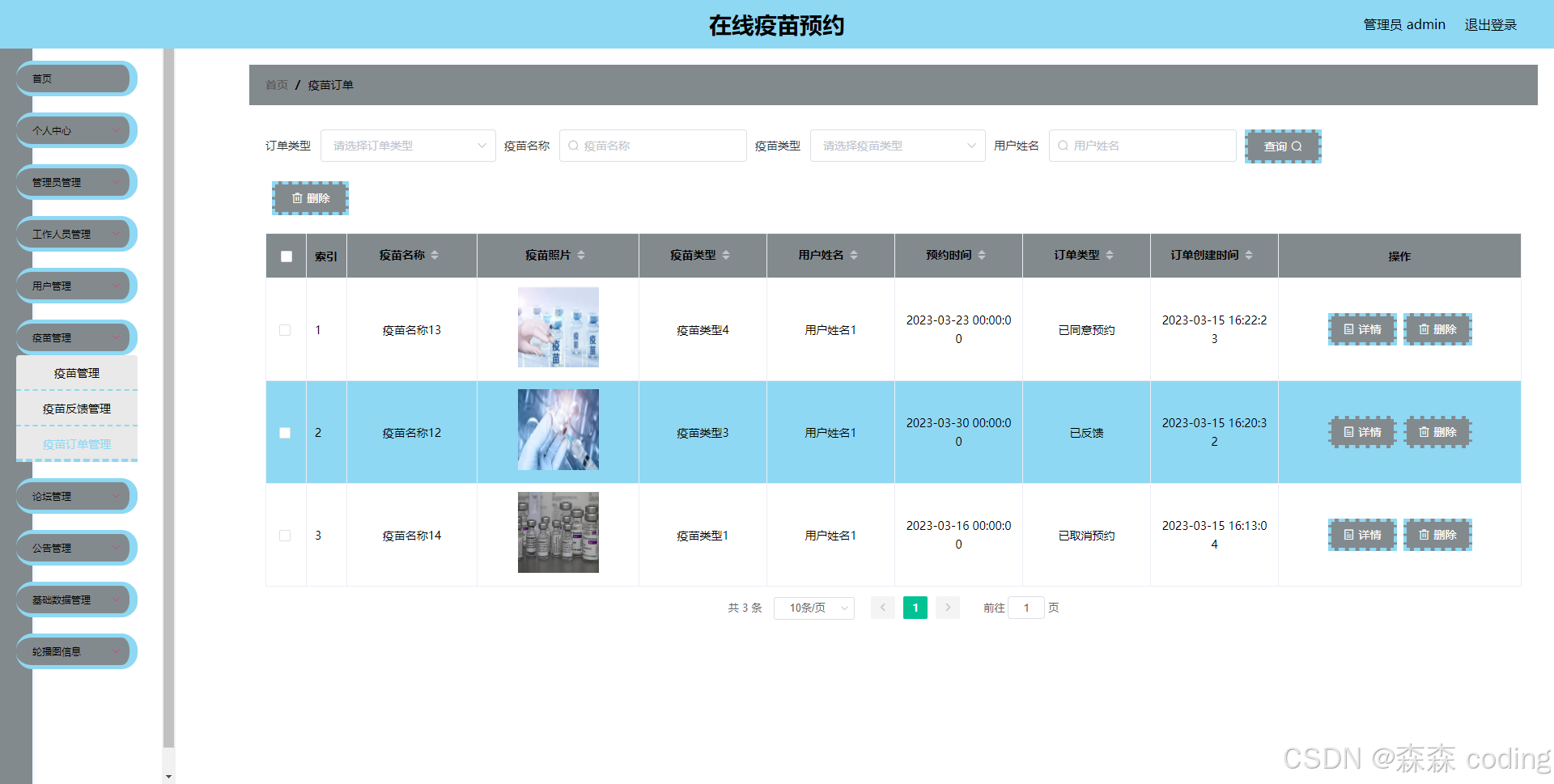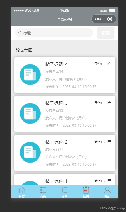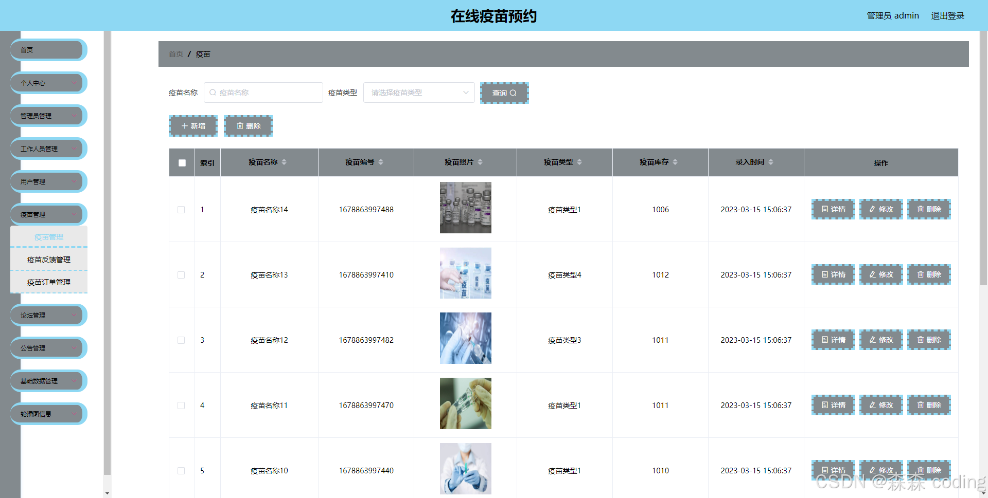 疫苗预约小程序包括用户、管理员两个模块 ⭐️用户功能:主要包括疫苗浏览、疫苗预约、疫苗采购、订单管理、公告查看、个人信息管理等 ⭐️管理员功能:用户管理、疫苗管理、公告管理、订单管理、轮播图管理等