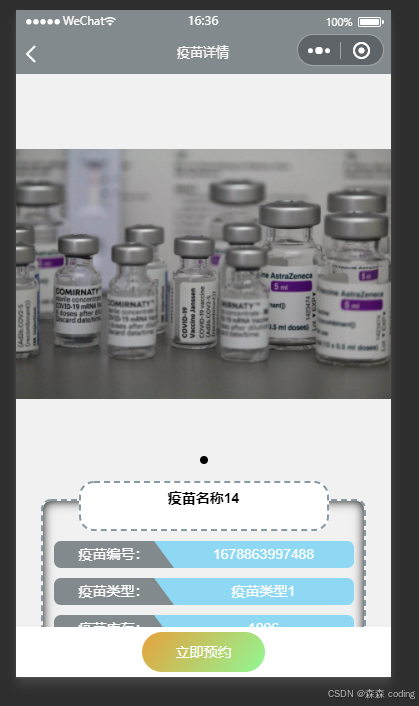 本系统为实现疫苗的预约订购,而打造的“疫苗预约小程序”,疫苗预约小程序是一个工作量丰富,实用性极强的选题,所以如果没有特殊要求 疫苗预约小程序是一个不错的选择,本疫苗预约小程序功能涵盖了疫苗管理、用户管理、公告管理、订单管理、轮播图管理等