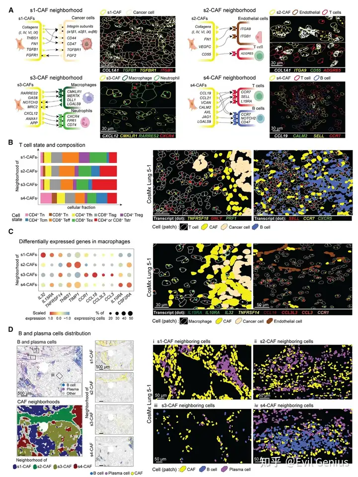 进一步分析了CosMx数据集中不同CAF邻域内主要免疫细胞(包括T细胞、巨噬细胞、B细胞和浆细胞)的状态与组成特征。