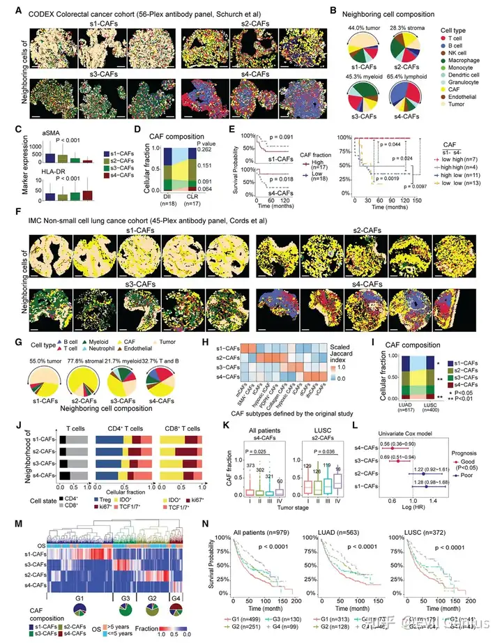 :s3-CAFs(尤其LUSC)和s4-CAFs(整体NSCLC)与更长生存期显著相关;根据CAF亚型组成将患者分为四组,G1(s1-CAFs主导)预后最差,G4(s4-CAFs富集)最佳,G2-G3居中且癌型特异性明显