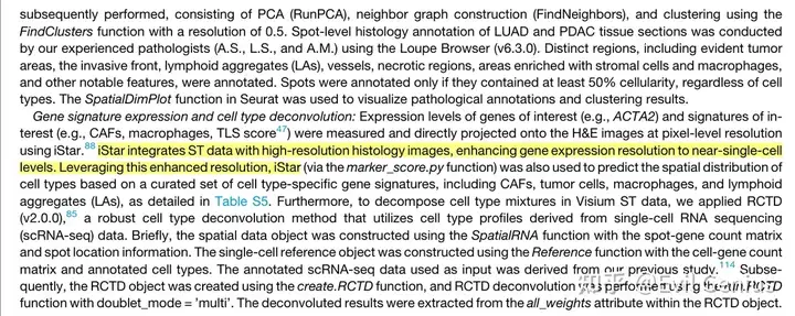 为验证该方法在spot级空间转录组(ST)数据中的适用性,分析了LUAD和胰腺癌(PDAC)的Visium数据。通过RCTD细胞类型反卷积和邻域向量聚类,在LUAD样本中成功识别出四种CAF亚型,其空间分布模式与原位特征吻合。使用iStar算法基于预设基因集进行区域推断的结果与病理医师标注高度一致,共定位分析显示:与癌细胞共区域的CAFs对应s1-CAFs,与巨噬细胞共区域的对应s3-CAFs,位于淋巴聚集区的则对应s4-CAFs。PDAC样本中主要重现了s1/s3-CAFs的分布特征。