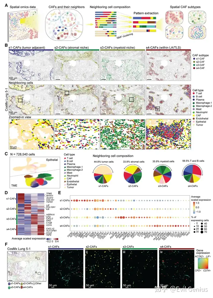 计算了每个CAF周围80μm半径范围内的细胞组成(即"邻域向量"),通过非负矩阵分解(NMF)进行空间模式提取,最终鉴定出四种空间特征迥异的CAF亚型:s1-CAFs、s2-CAFs、s3-CAFs和s4-CAFs(依据微环境划分细胞亚群)。各CAF亚型展现出独特的空间分布模式、邻近细胞组成及互作网络。