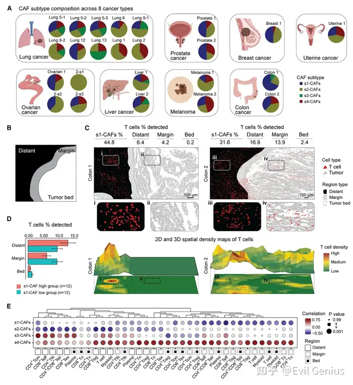 通过计算各区域CAF亚型占比与T细胞浸润水平,发现: