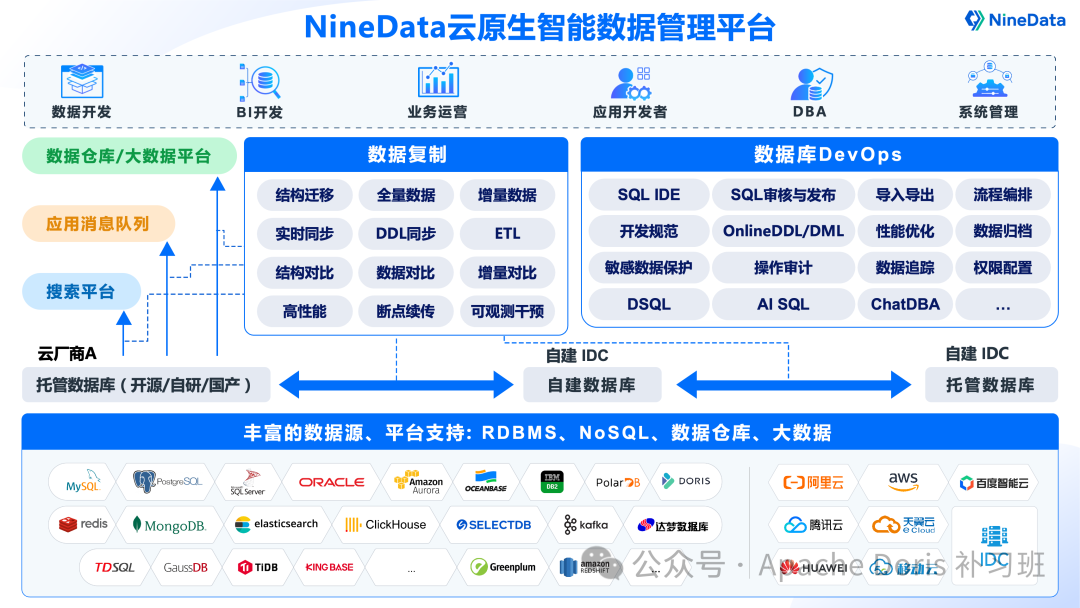 NineData 是集成了数据库 DevOps、数据复制、数据备份、数据对比多个模块的云服务,支持混合云(自建库+云数据库的业务架构)和多云(多个不同云厂商数据库组成的业务架构)架构下的企业数据管理,大幅降低企业的数据运维难度和成本。