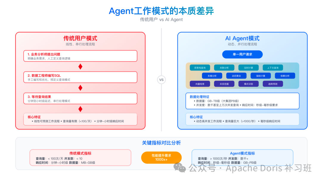 而在Agent时代,用户直接询问AI Agent同样的问题,Agent会在几秒钟内:首先分析用户表结构获取用户基础信息,然后查询行为日志表分析用户活跃度,接着关联订单表计算购买频率,再计算用户价值评分,最后应用流失预测模型。这一系列操作可能触发十几个数据库查询,但对用户来说只是一次简单的对话。