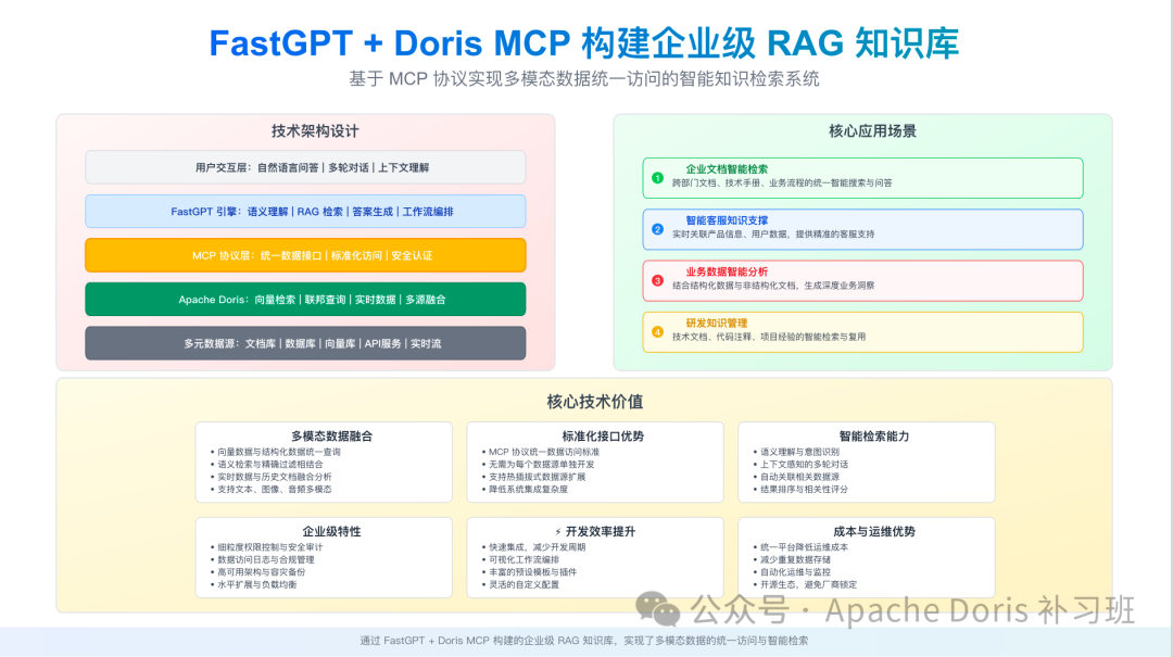 FastGPT作为领先的开源RAG平台,与Doris MCP的结合创造了企业知识管理的全新范式。这不仅仅是简单的文档检索,而是实现了结构化业务数据与非结构化知识内容的深度融合。