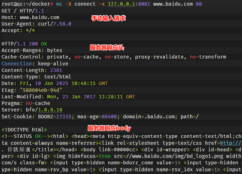 socat - PROXY:127.0.0.1:www.baidu.com:80,proxyport=8081用 nc -X connect 代理测试:
