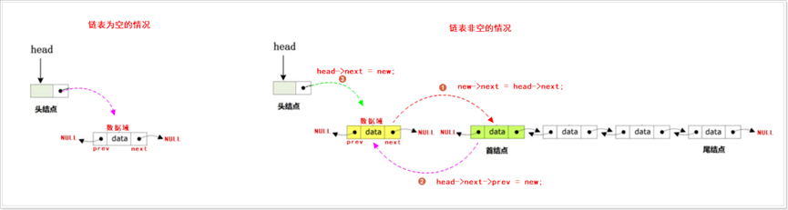 }(3) 根据情况把新结点插入到链表中,此时可以分为尾部插入、头部插入、指定位置插入: