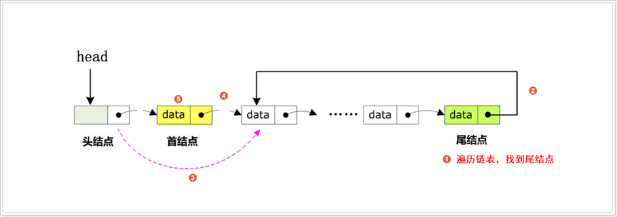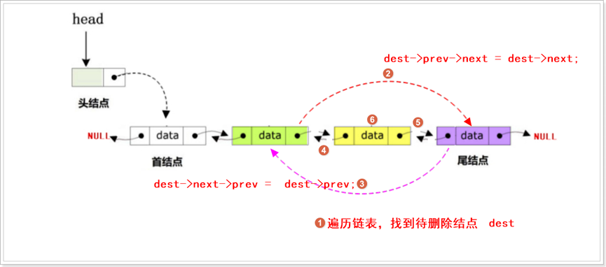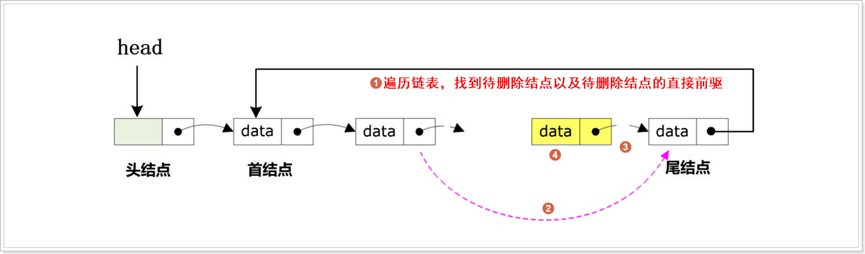 (4) 根据情况可以从链表中删除某结点,此时可以分为尾部删除、头部删除、指定结点删除: