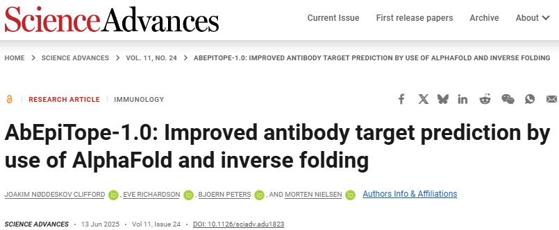 Joakim Nøddeskov Clifford et al. ,AbEpiTope-1.0: Improved antibody target prediction by use of AlphaFold and inverse folding.Sci. Adv.11,eadu1823(2025).DOI:10.1126/sciadv.adu1823