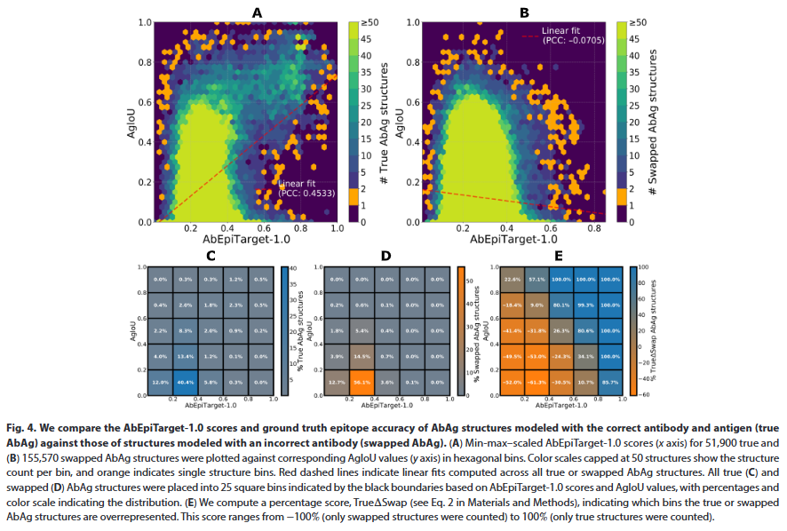 研究人员对每个抗原构建了多个抗体配对模型(包括真实抗体和随机对照抗体),并使用 AbEpiTarget-1.0 与 AlphaFold-2.3 对这些结构进行评分。