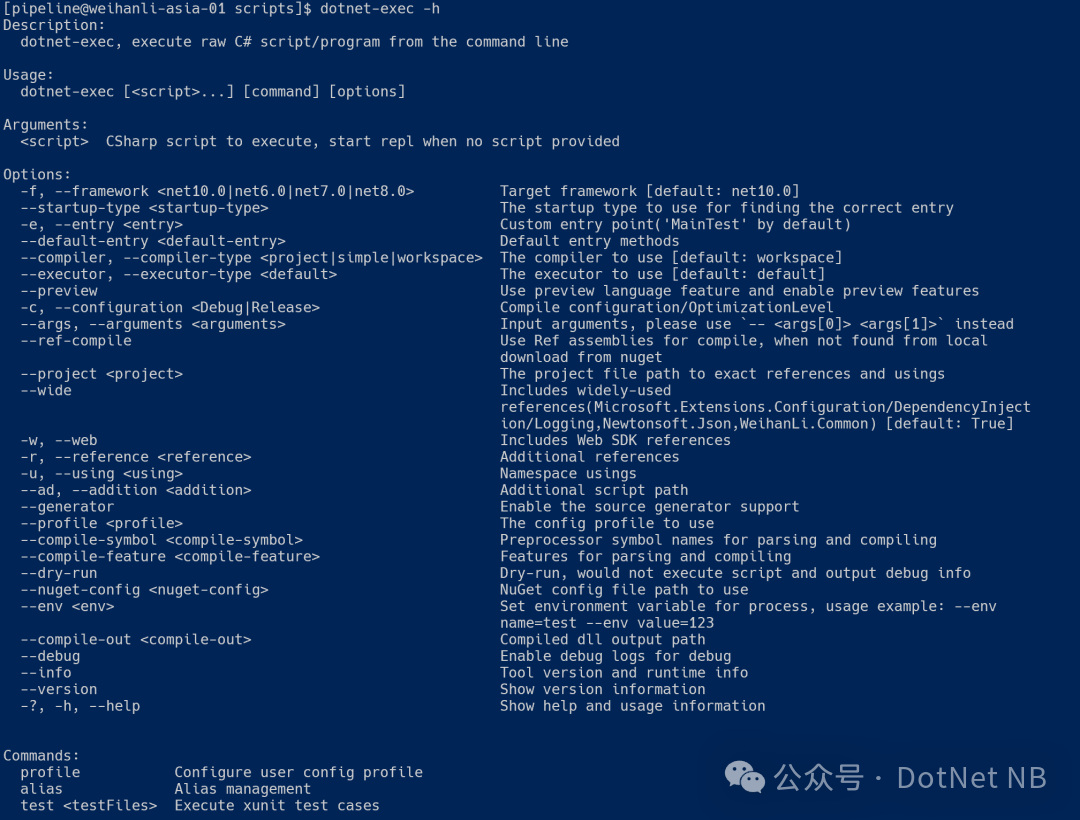 dotnet tool update -g dotnet-execute --prerelease执行 dotnet-exec -h 或者 dotnet-exec --help 即可看到一些使用说明,更多使用可以参考文档