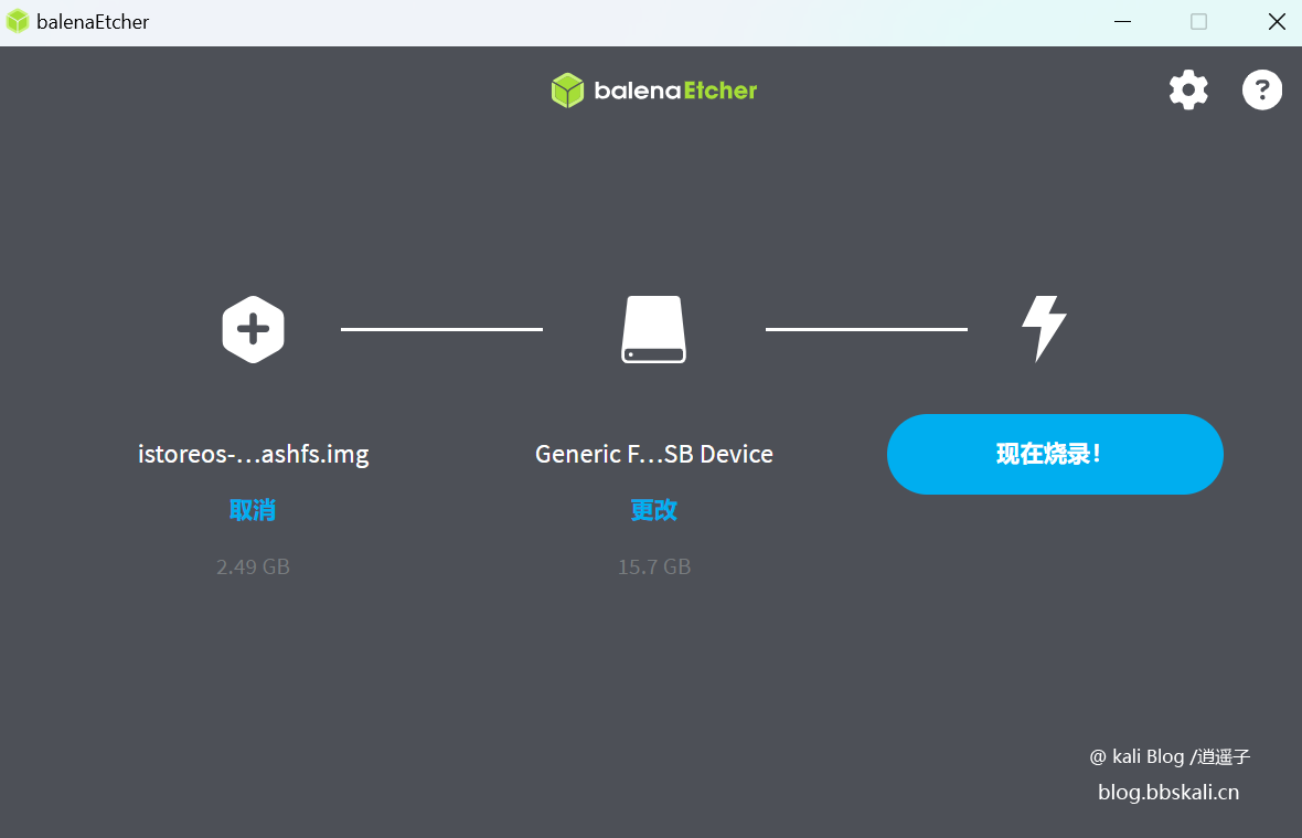 运行balenaEtcher。选择下载的固件(注意不要解压镜像包),开始制作。