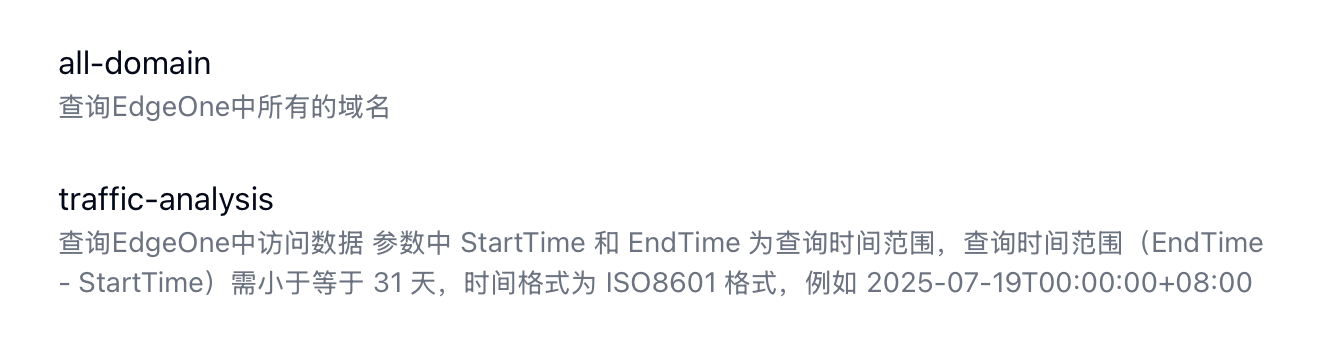 all-domain工具返回 EdgeOne 中所有管理的域名,traffic-analyse工具根据条件返回流量、请求数两个指标。
