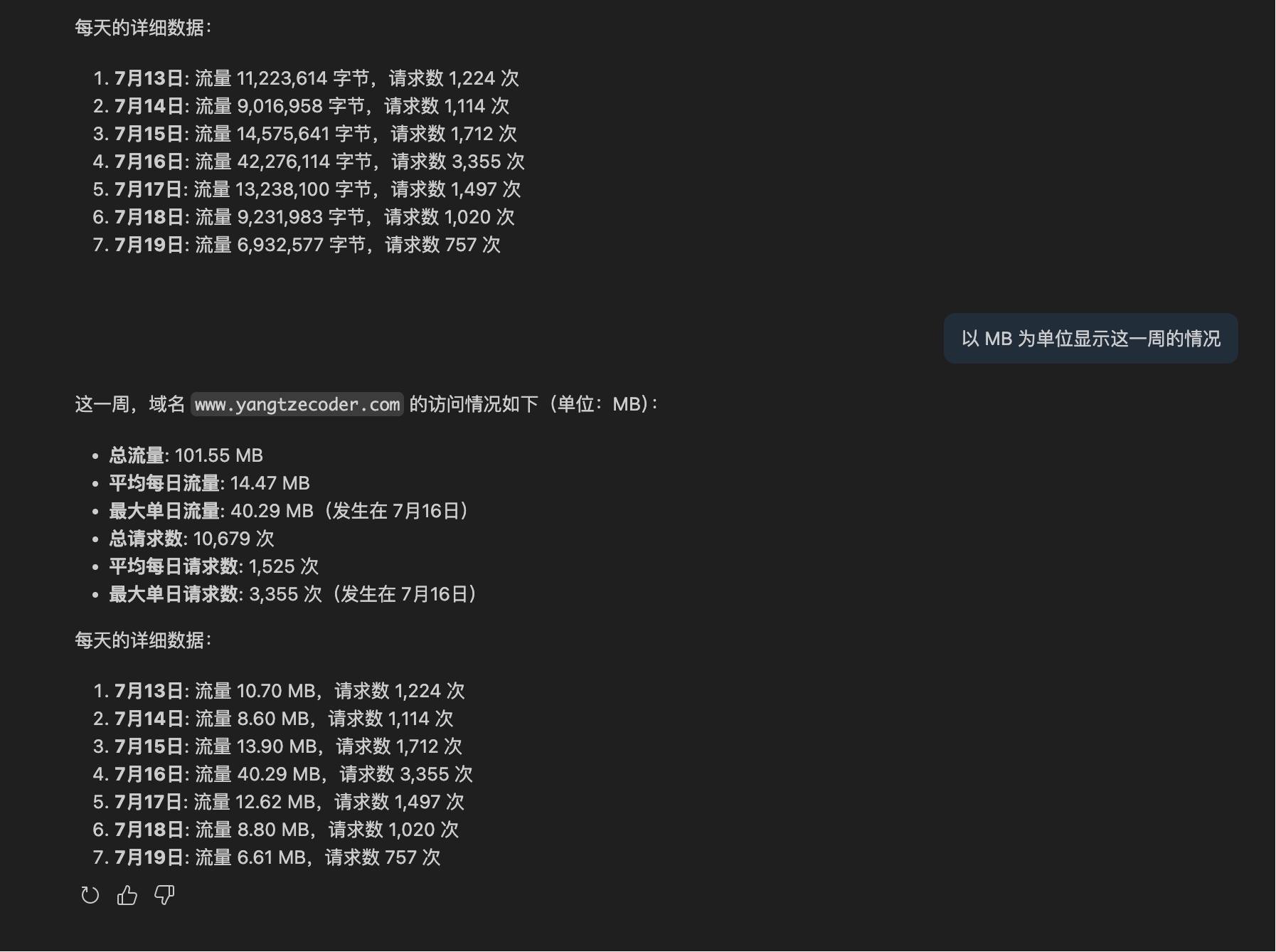 我们看到单查询的时候,流量是以字节为单位显示的,最好是能以 MB 为单位显示,通过要求使用 MB 显示,效果看起来也不错: