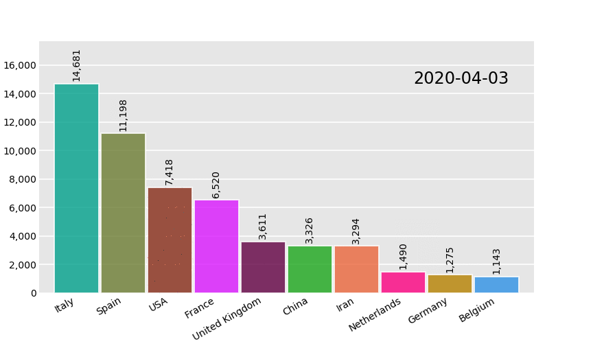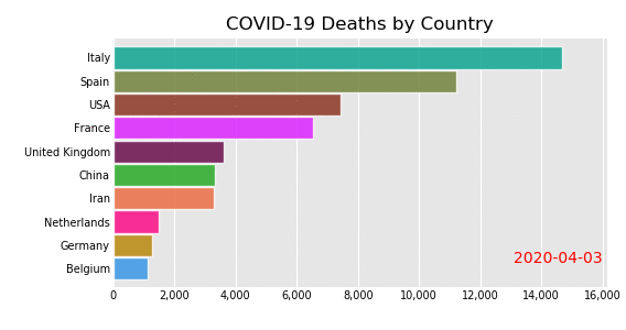 bcr.bar_chart_race(df, 'covid19_horiz.gif', fixed_order=['Iran', 'USA', 'Italy', 'Spain', 'Belgium'])