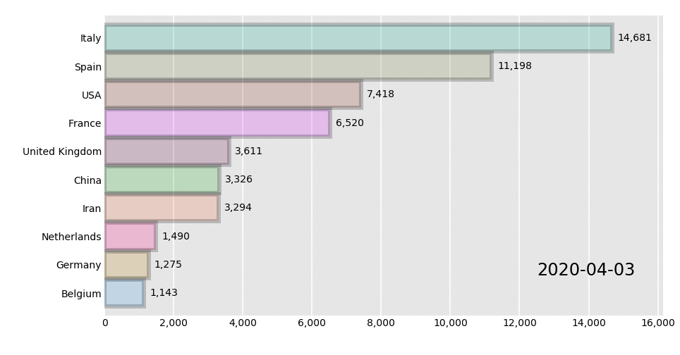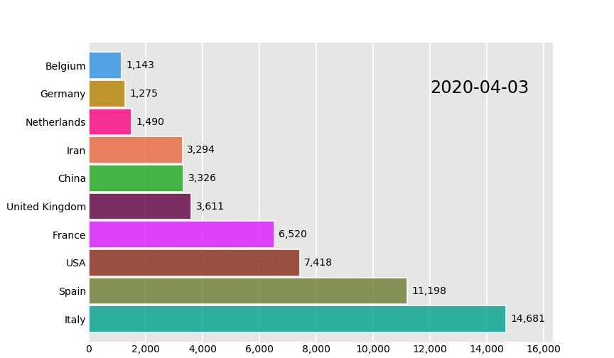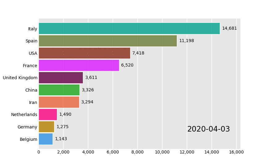 bcr.bar_chart_race(df, 'covid19_horiz.gif', bar_kwargs={'alpha': .2, 'ec': 'black', 'lw': 3})