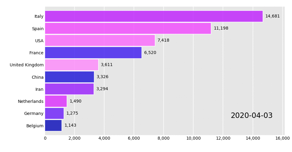 bcr.bar_chart_race(df, "covid19_horiz.gif")我们看到代码非常简单,就是将数据转成 pandas 的 DataFrame,然后调用 bar_chart_race 即可生成 GIF 图像。