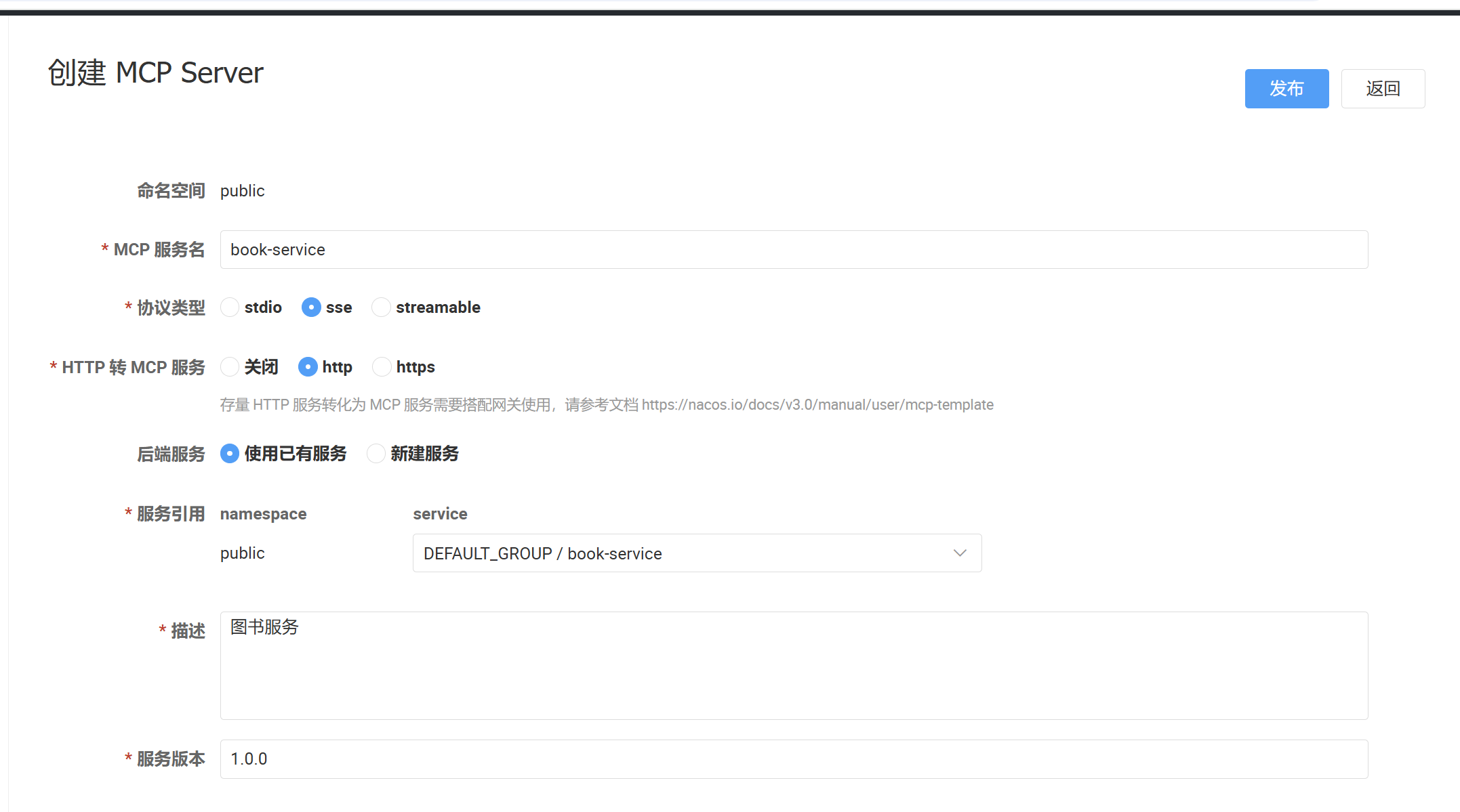 sse 或 streamablehttp 或 httpsbook-service1.0.0)填写完成后,点击右上角的发布按钮完成创建。