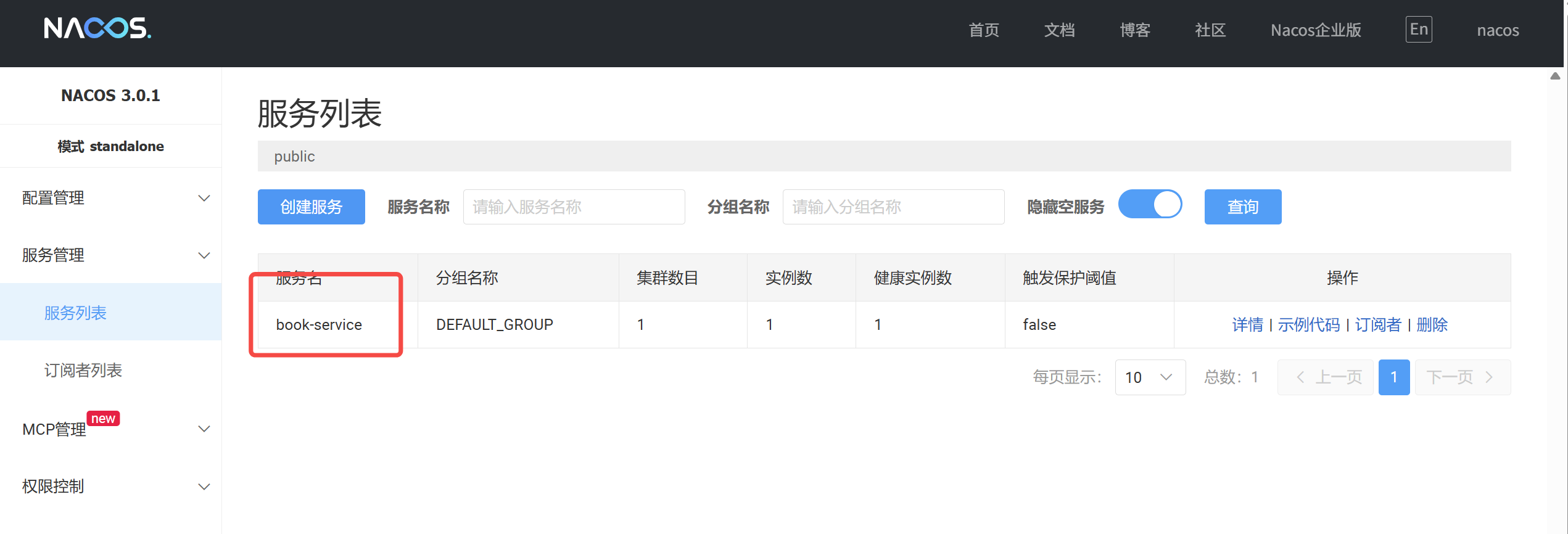 password: nacos启动 Spring Boot 应用后,服务会自动注册到 Nacos 。您可以在 Nacos 控制台的"服务管理"→"服务列表"中看到已注册的book-service。