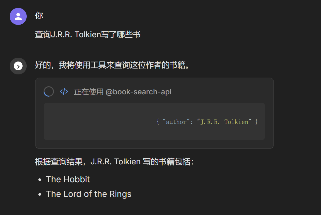 可以看到,AI成功调用了我们的服务,并返回了J.R.R. Tolkien的作品列表。